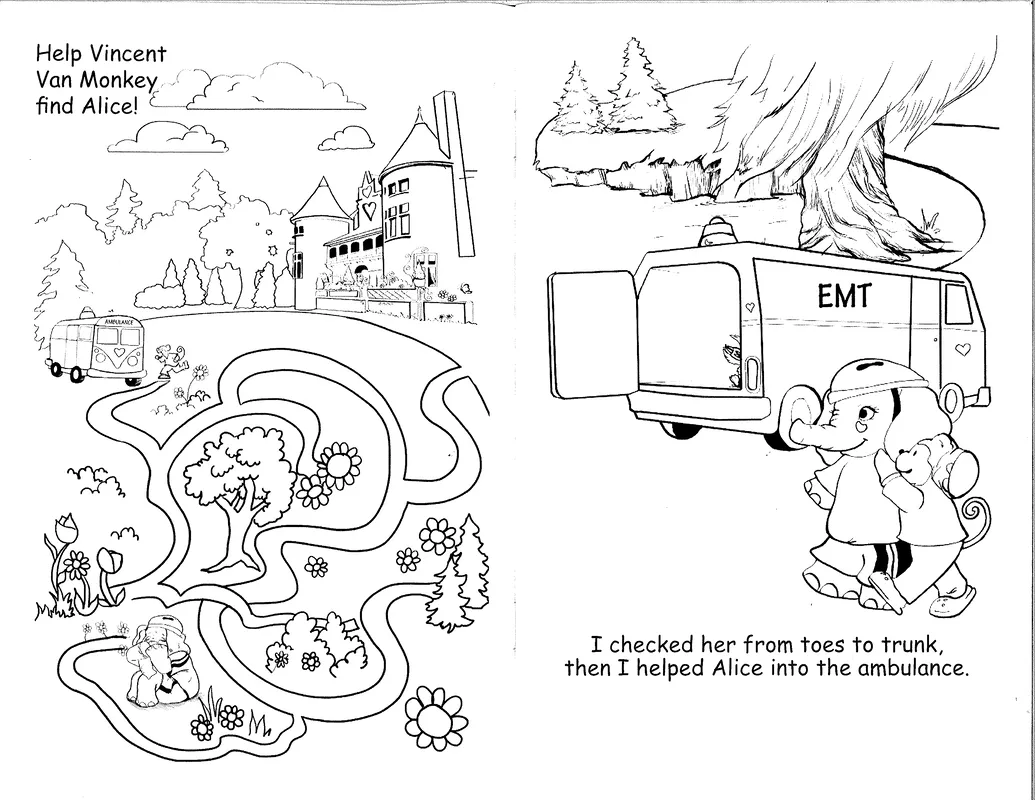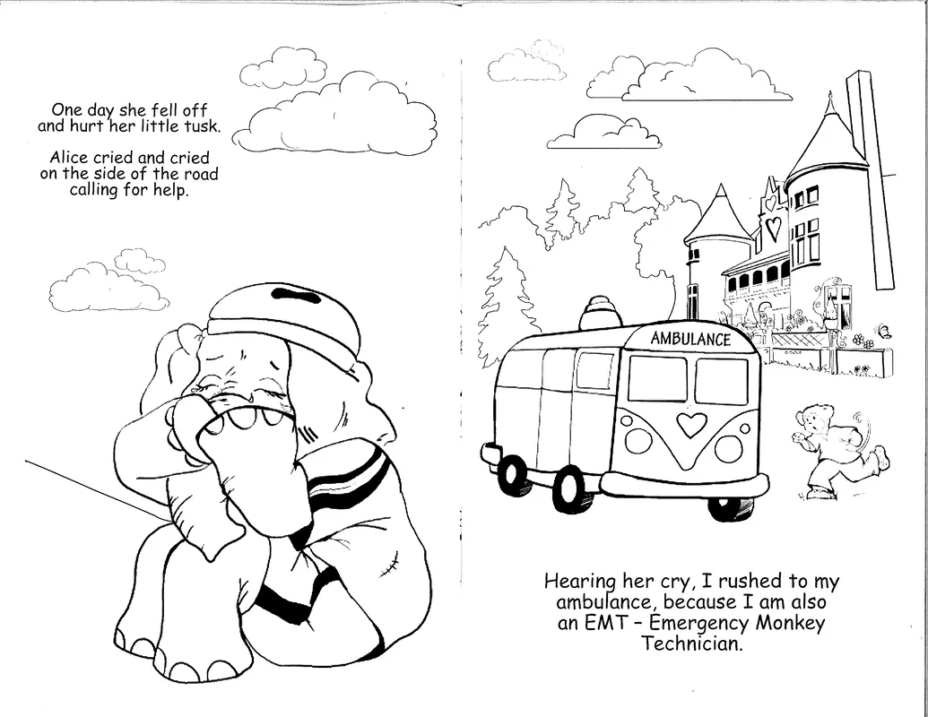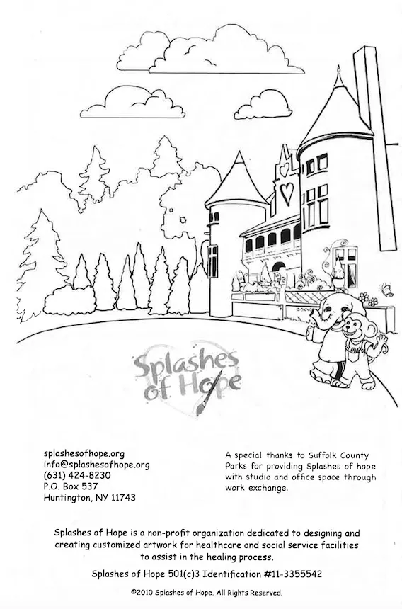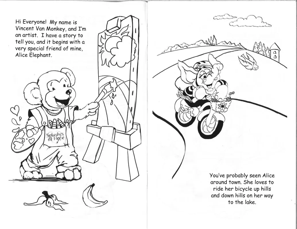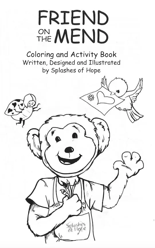 Created by Splashes of Hope artists - Friend on the Mend is a custom coloring book for pediatric patients in hospitals. Friend on the Mend tells the story of Alice the Elephant, whose trip to the hospital after a fall from her bike is greatly improved when her friend Vincent Van Monkey paints her a mural. The book depicts what children will see in the medical environment, for children to acclimate and feel comfortable.